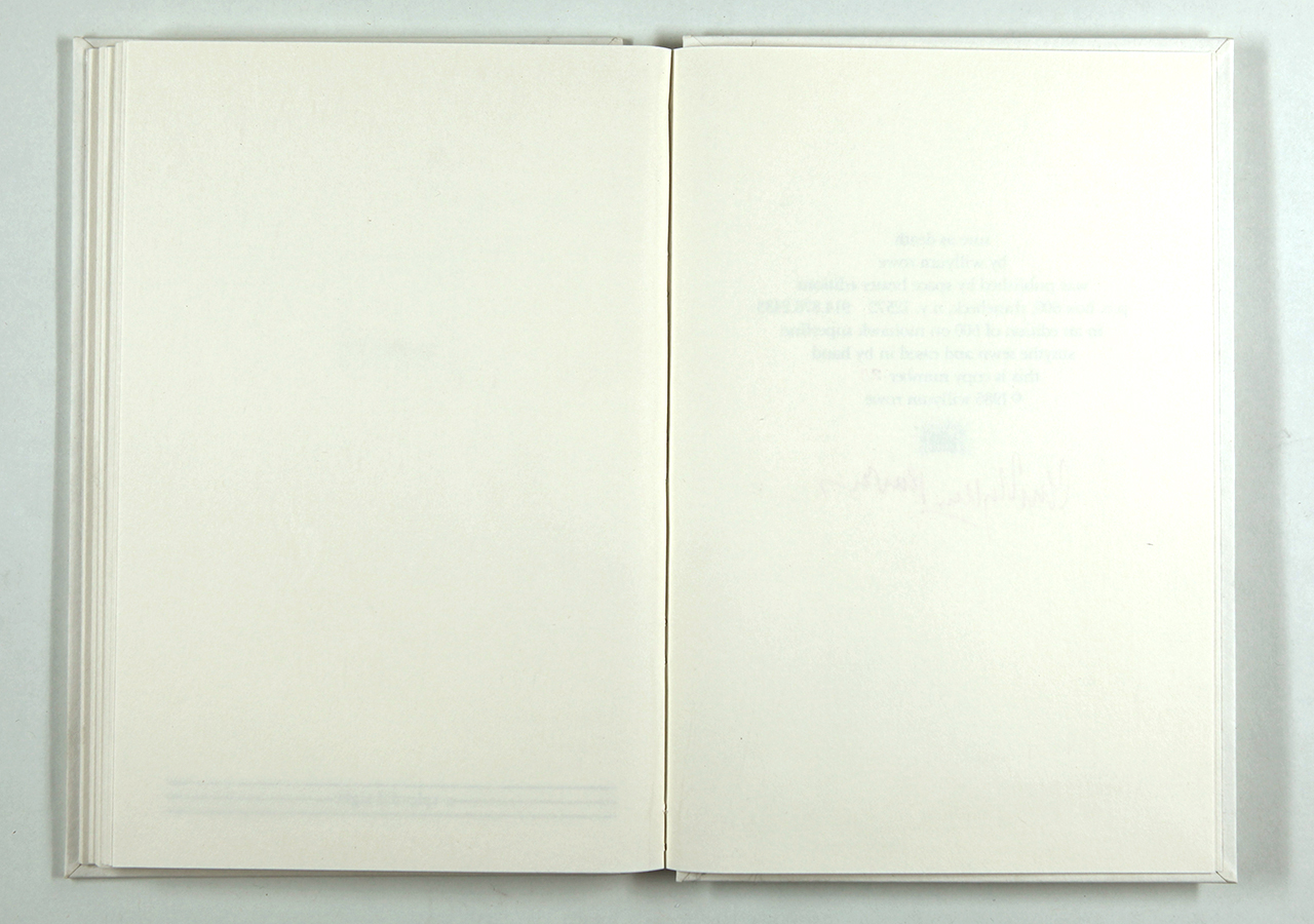 The book is 7.25" x 5" with foil-stamped black Iris binding cloth spine and offset printed on Mohawk Superfine with board covers. Signed and numbered by Willyum Rowe. $95.