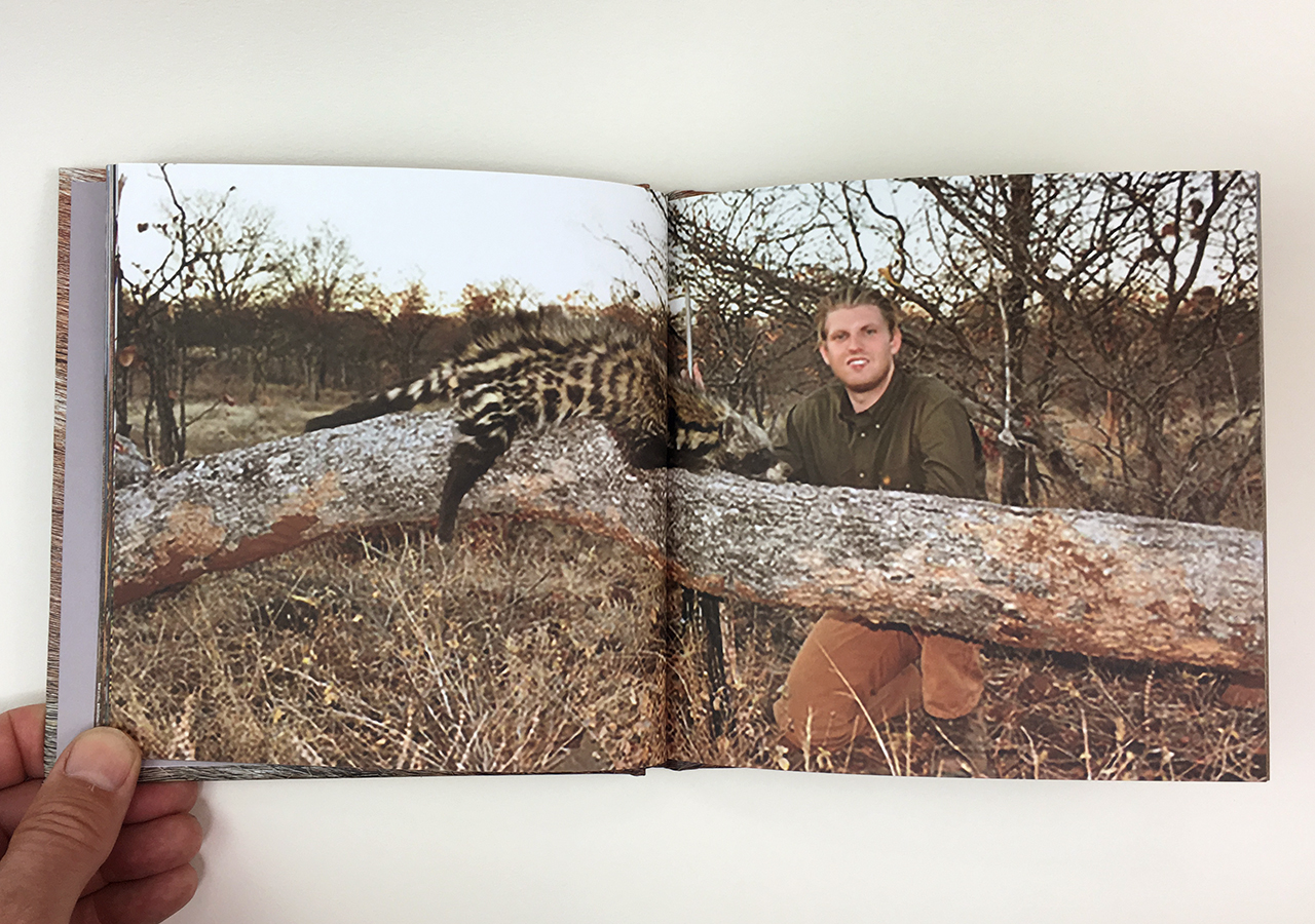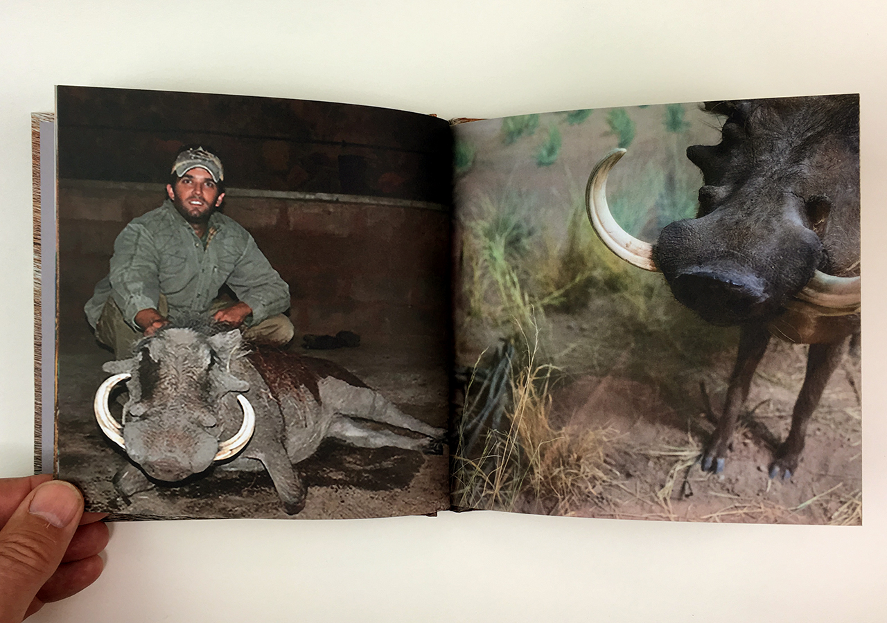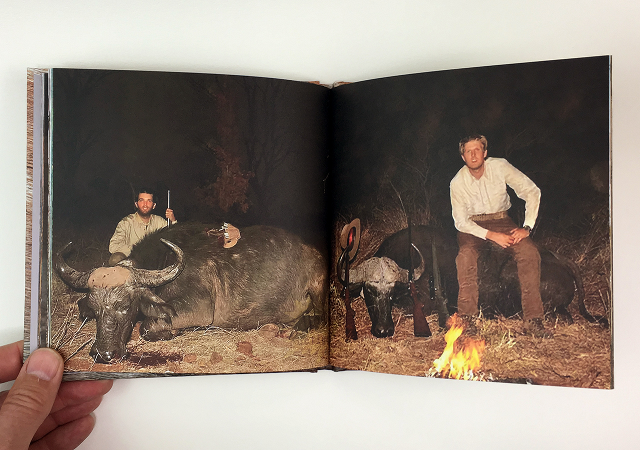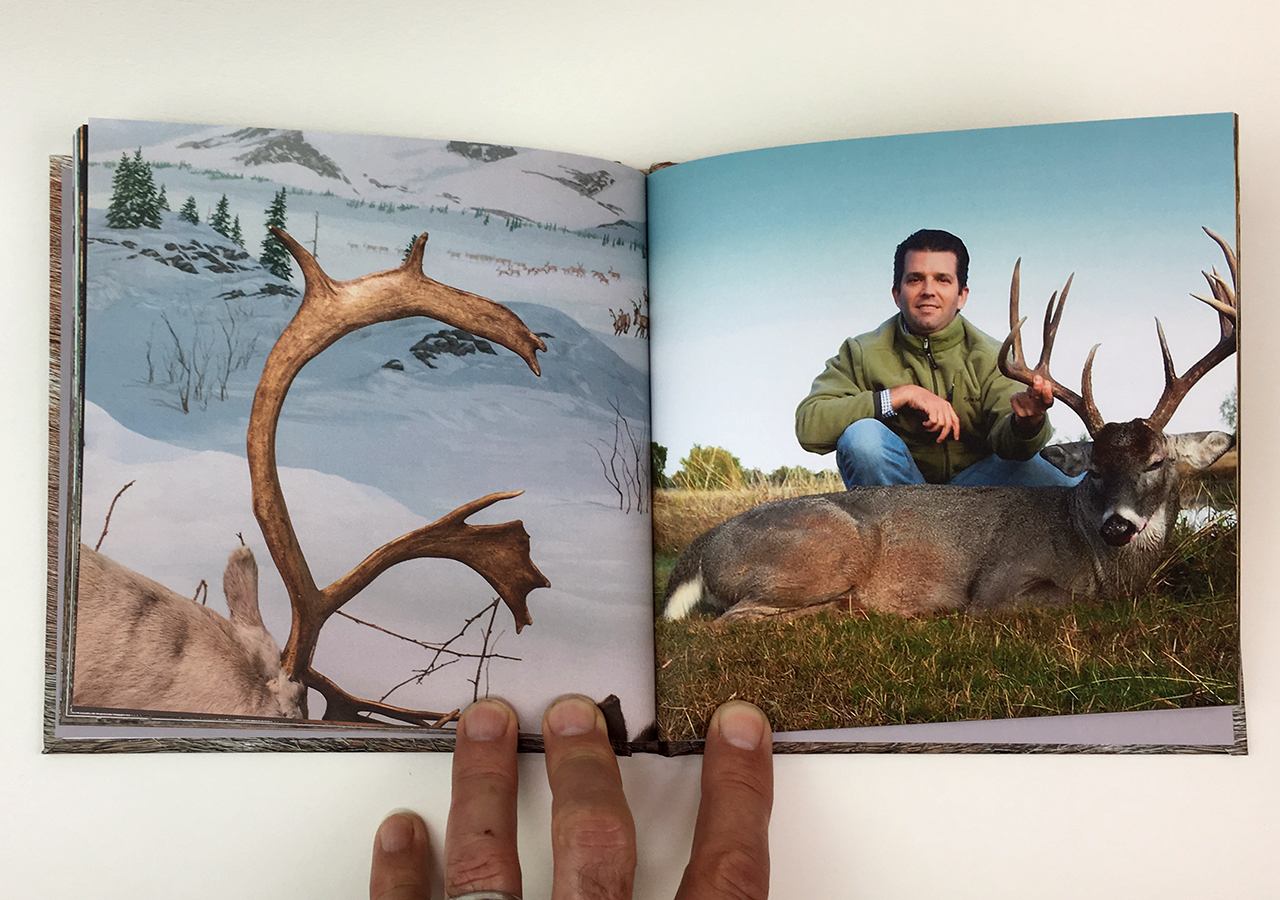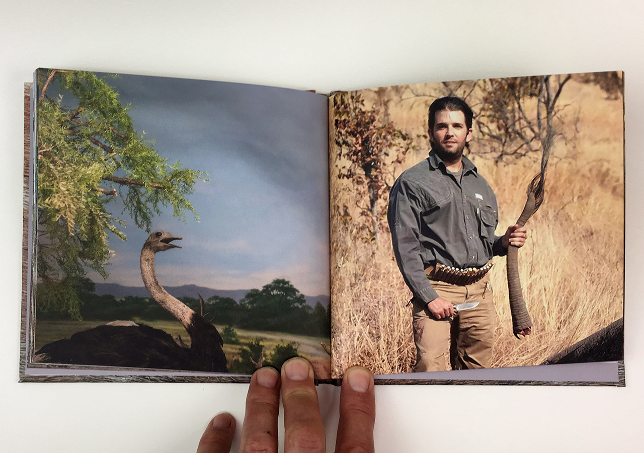 TROPHY is a reaction to the current social and political state of the United States of America and the criminal and immoral administration that currently wields power in our country. Although superficially the subject matter is the cruelty of the Trump sons, their activities are an indicator of the worldview of the morally bankrupt family and administration of Donald J. Trump. The photographs of the animal dioramas and fur details were taken at the International Wildlife Museum in Tucson, AZ. The big-game trophy photographs of Donald J. Trump Jr. and Erik Trump were obtained from the internet, presumably Trump family travel and safari photographs, and have no photographer attribution.