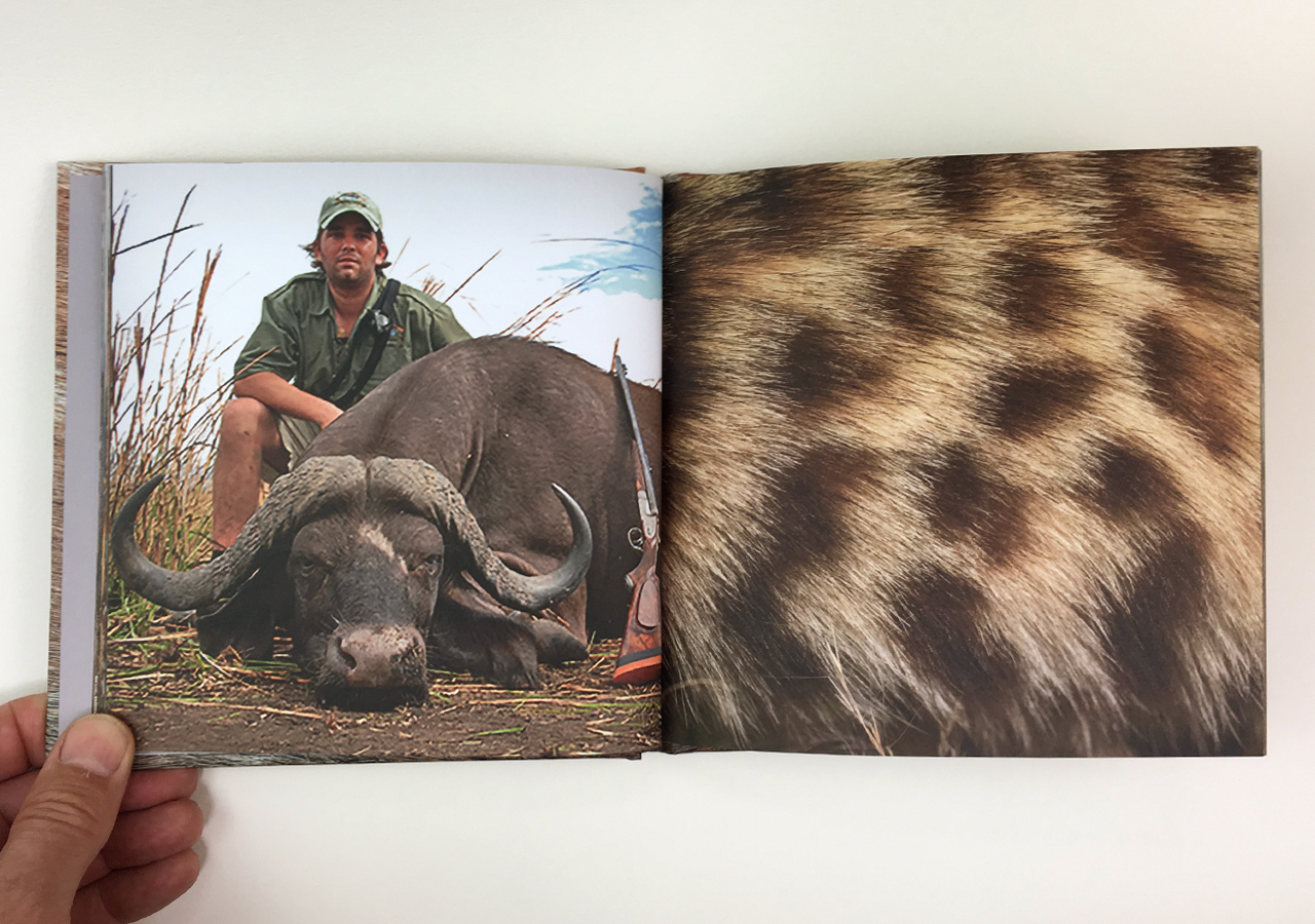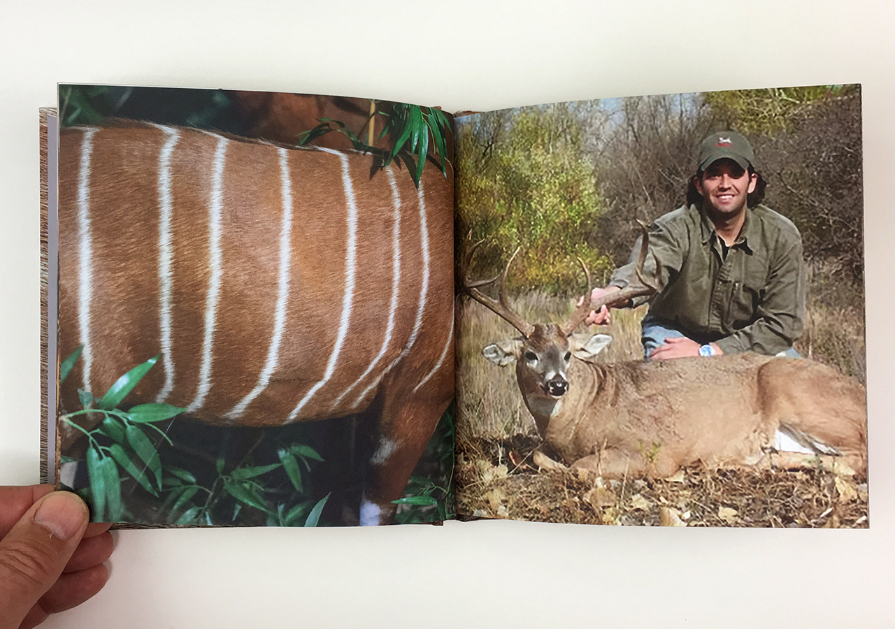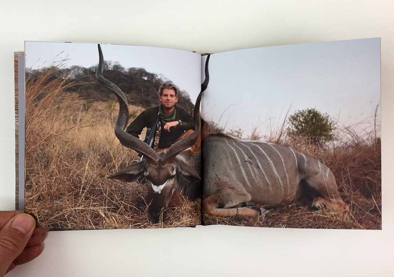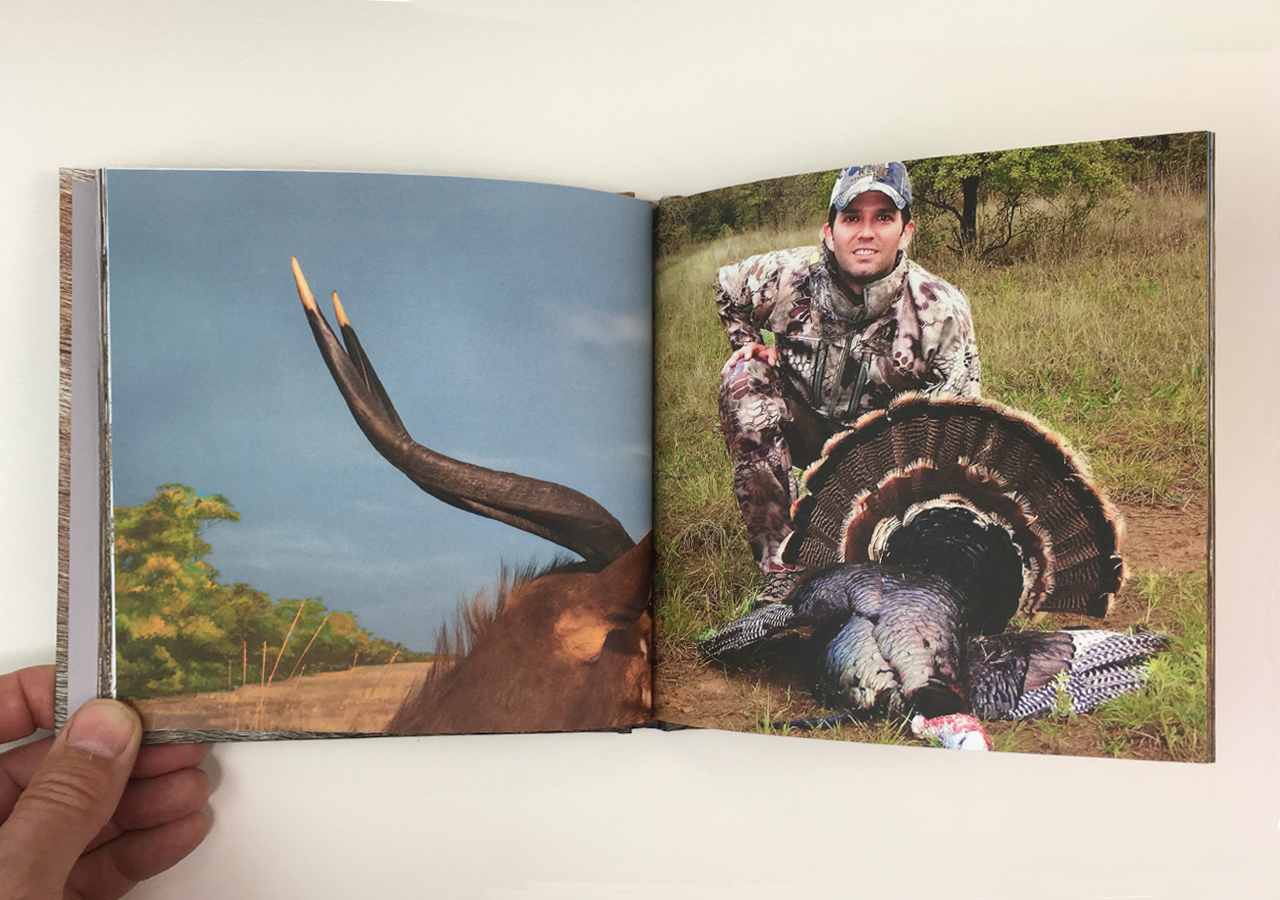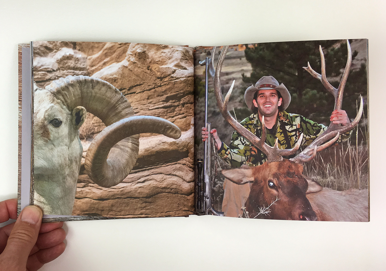 TROPHY is a reaction to the current social and political state of the United States of America and the criminal and immoral administration that currently wields power in our country. Although superficially the subject matter is the cruelty of the Trump sons, their activities are an indicator of the worldview of the morally bankrupt family and administration of Donald J. Trump. The photographs of the animal dioramas and fur details were taken at the International Wildlife Museum in Tucson, AZ. The big-game trophy photographs of Donald J. Trump Jr. and Erik Trump were obtained from the internet, presumably Trump family travel and safari photographs, and have no photographer attribution.