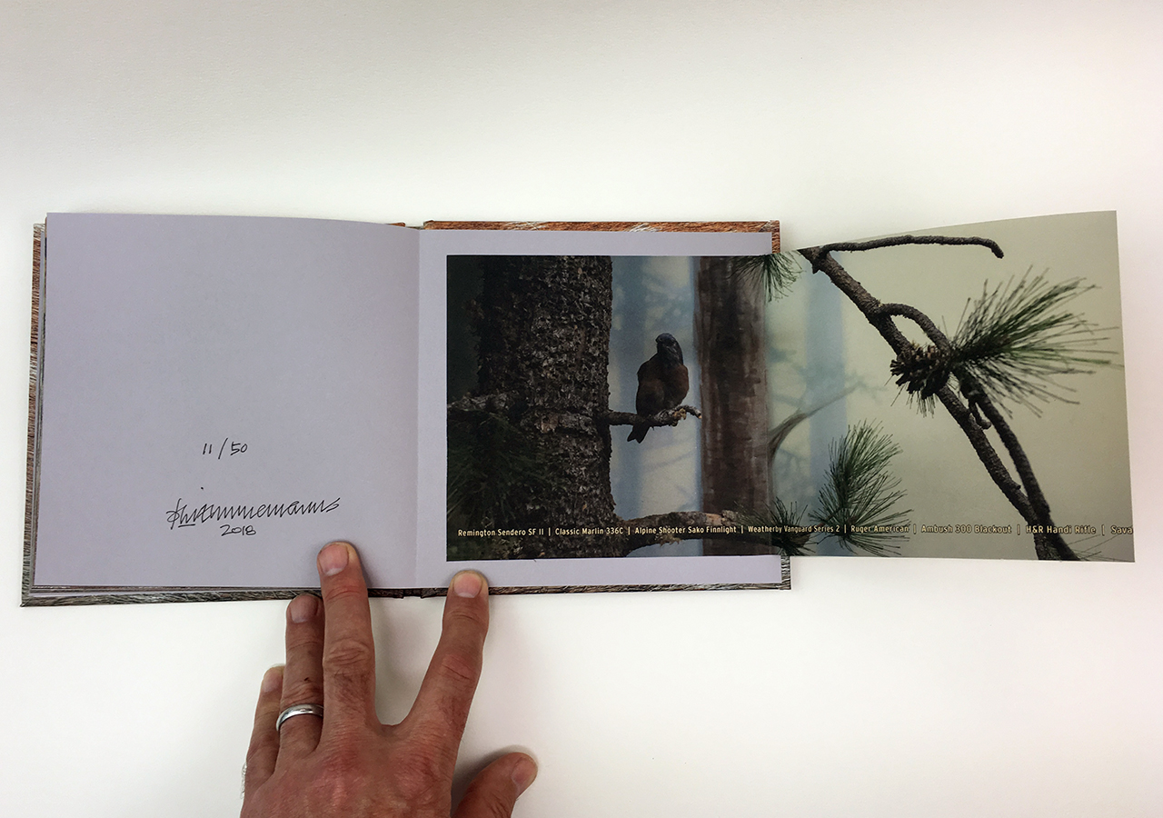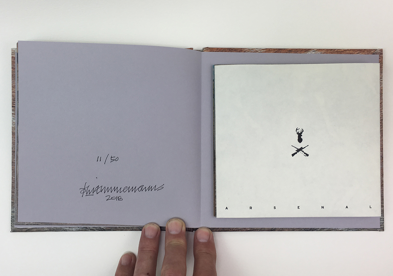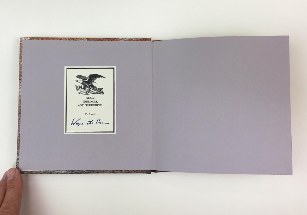 This edition was printed in an edition of fifty and they are signed and numbered. The inside text block and cover were printed by HP Indigo digital printing on archival Mohawk Superfine. The Ex Libris book plate in the front, and the accordion 'arsenal' section at the rear of the book, were printed by archival inkjet pigment on acid-free French Paper Co. paper. The book dimensions are 7" x 7" x 5/8" (17.75cm x 17.75cm x 1.5cm). The book has 68 pages, is hardcover bound, and is priced at $125.