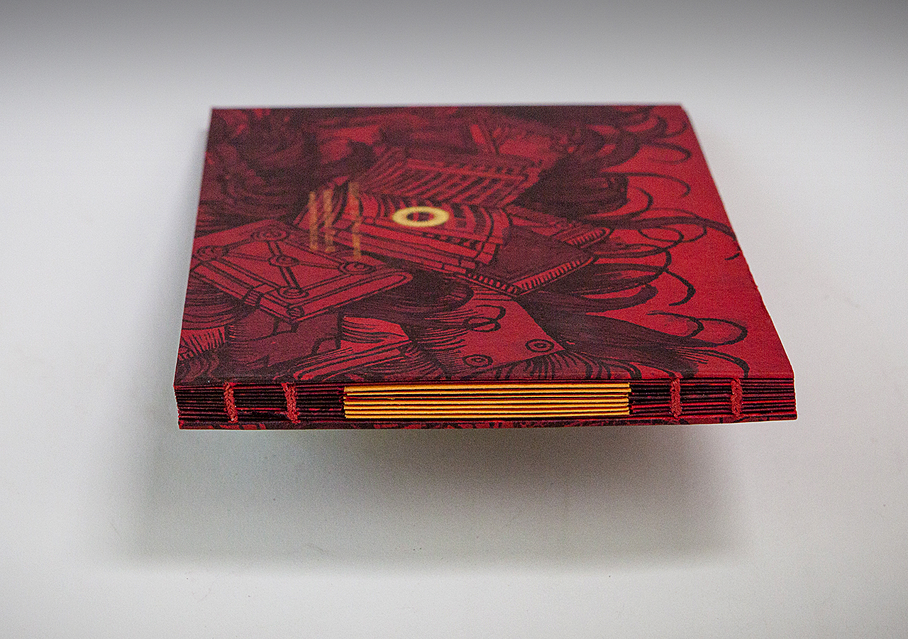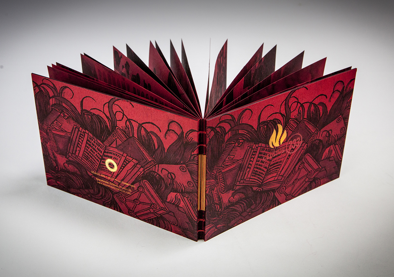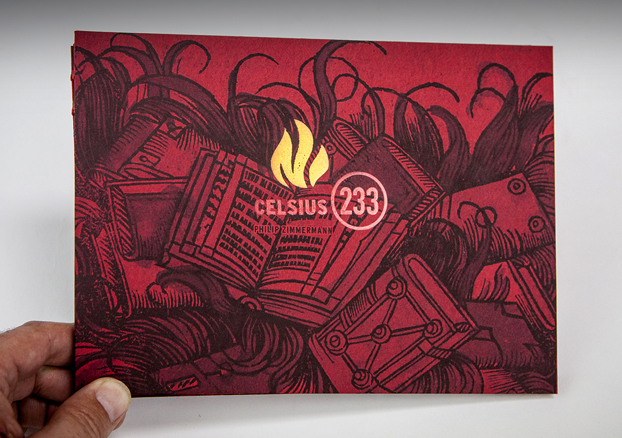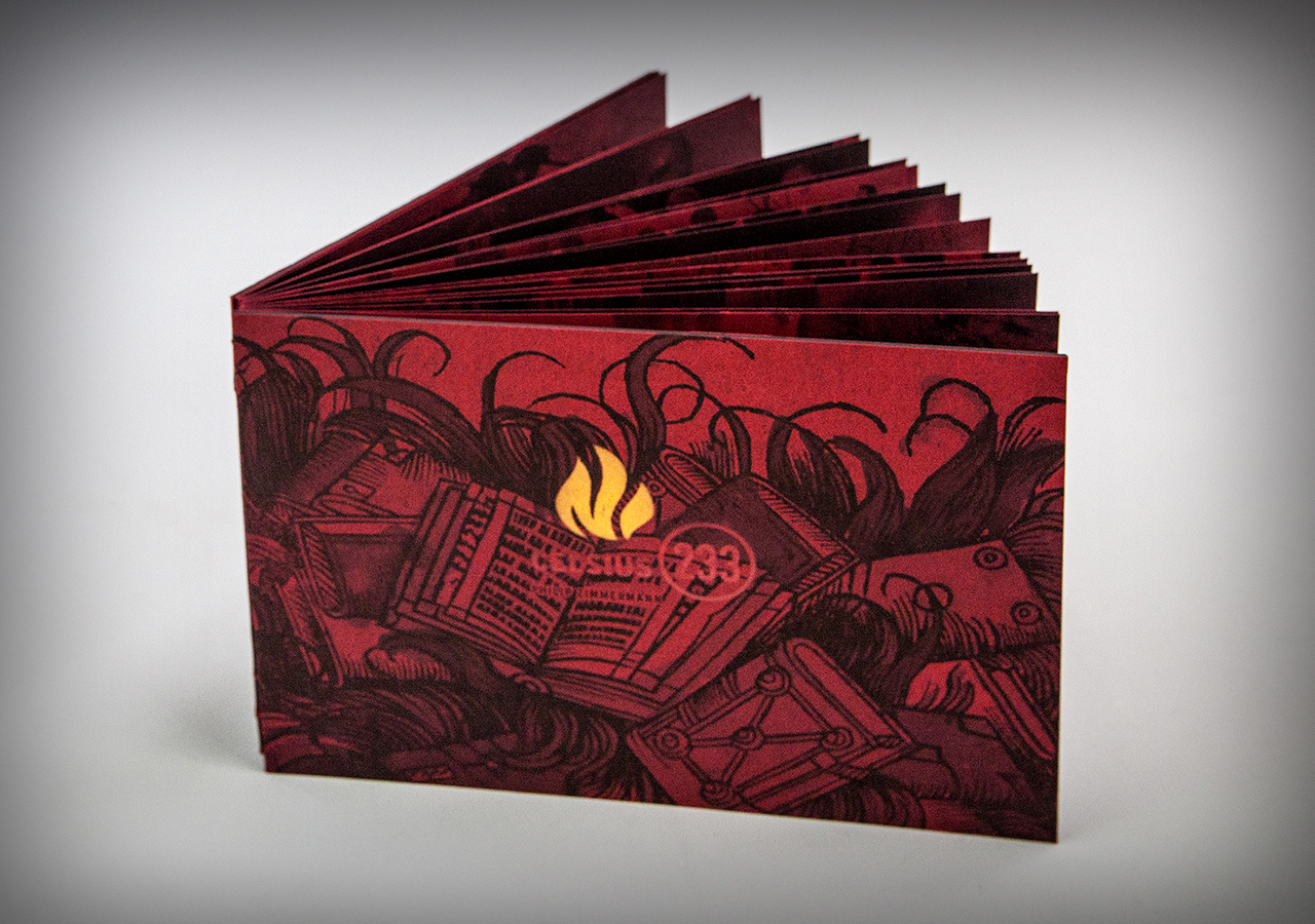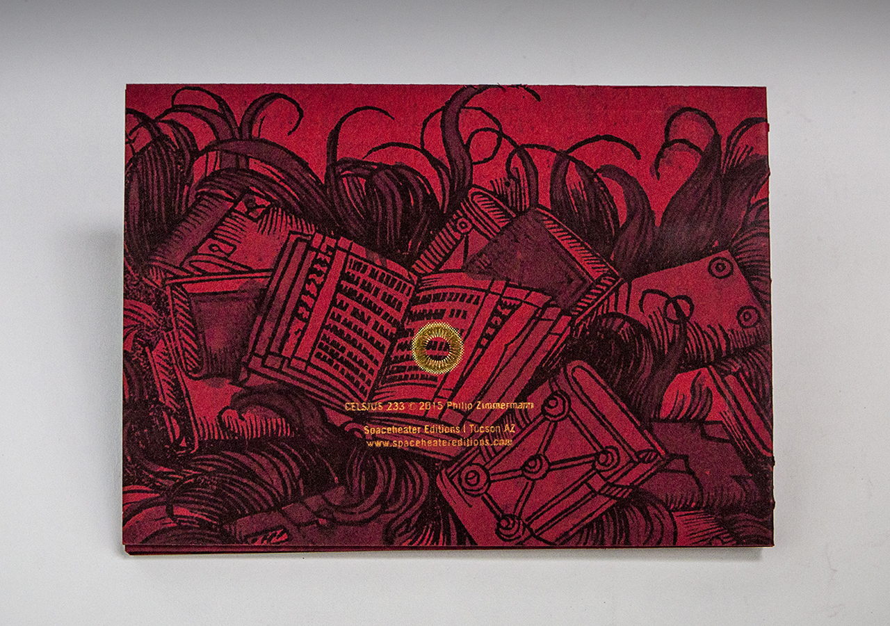 Celsius 233 has 40 pages and is handbound using a multi-needle Coptic stitch with sewn-on hard covers made of acid-free solid-core black museum board. The paper is acid-free French Paper. The images are printed using archival inkjet ink with three-color foil stamping on the cover, the title page and the back cover. The interior flame sheets are loose-inserted in a slot in each interior folio. It is printed in a signed and numbered edition of fifty and comes in an acid-free phase box. Dimensions are 6.5" x 9" x .375" (16.5cm x 23cm x 1cm). The price of the limited edition handbound book is $375 and includes a Blu-ray DVD (see below).