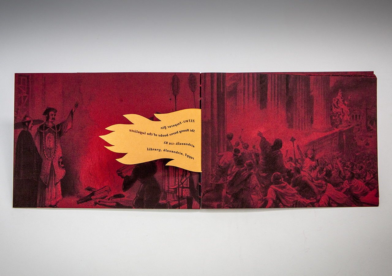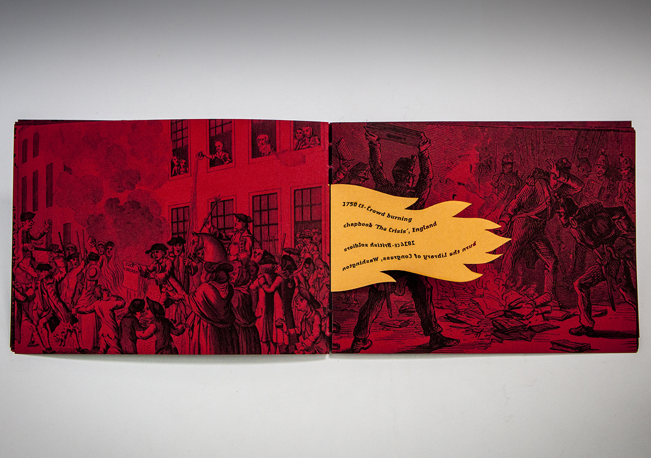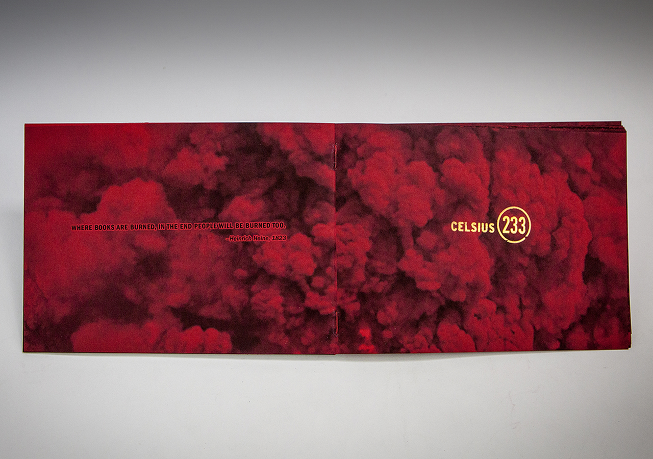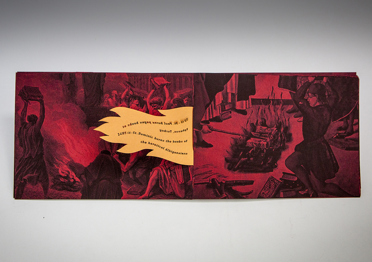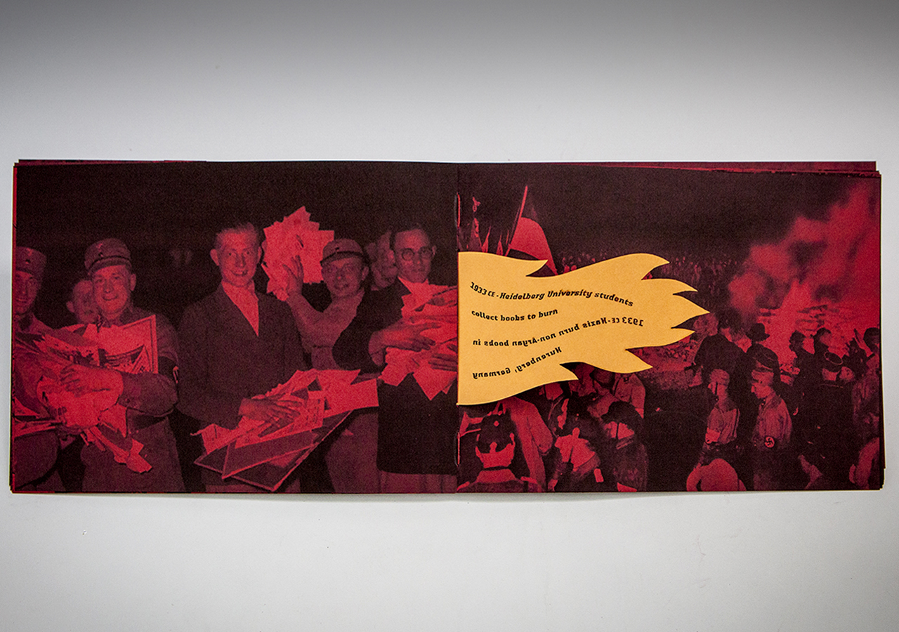 Celsius 233 came out of this research. The book contains 40 pages displaying acts of libricide in chronological order. The title page spread includes a famous quote by Heinrich Heine, whose own literary work was included in some of the book burnings orchestrated by the Nazis. Inserted small orange laser-cut tongues of flame describe the date and action of each image through time. The images were obtained on-line, mostly from the Library of Congress and the National Archive and some educational institution archives. A list of credits appears in a colophon.