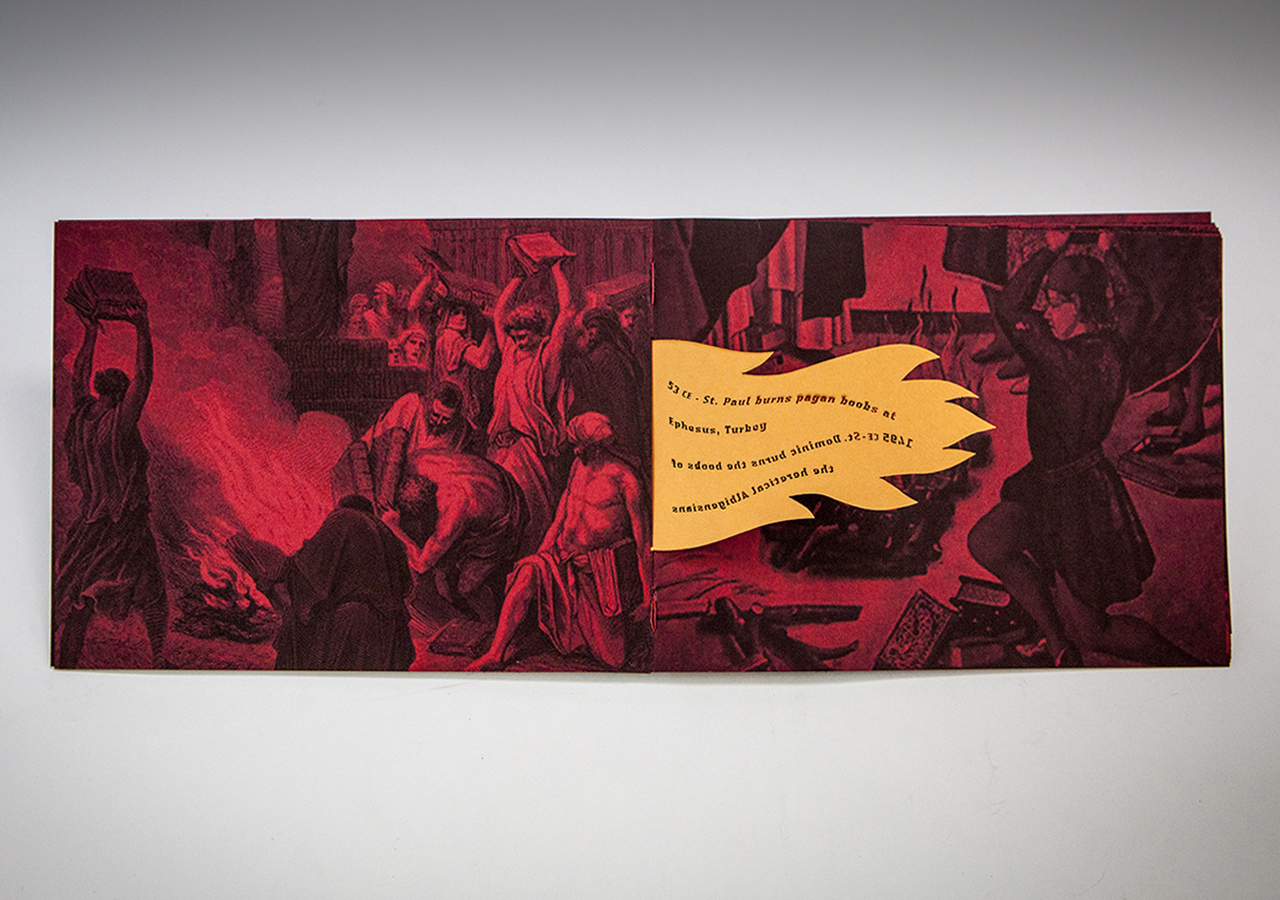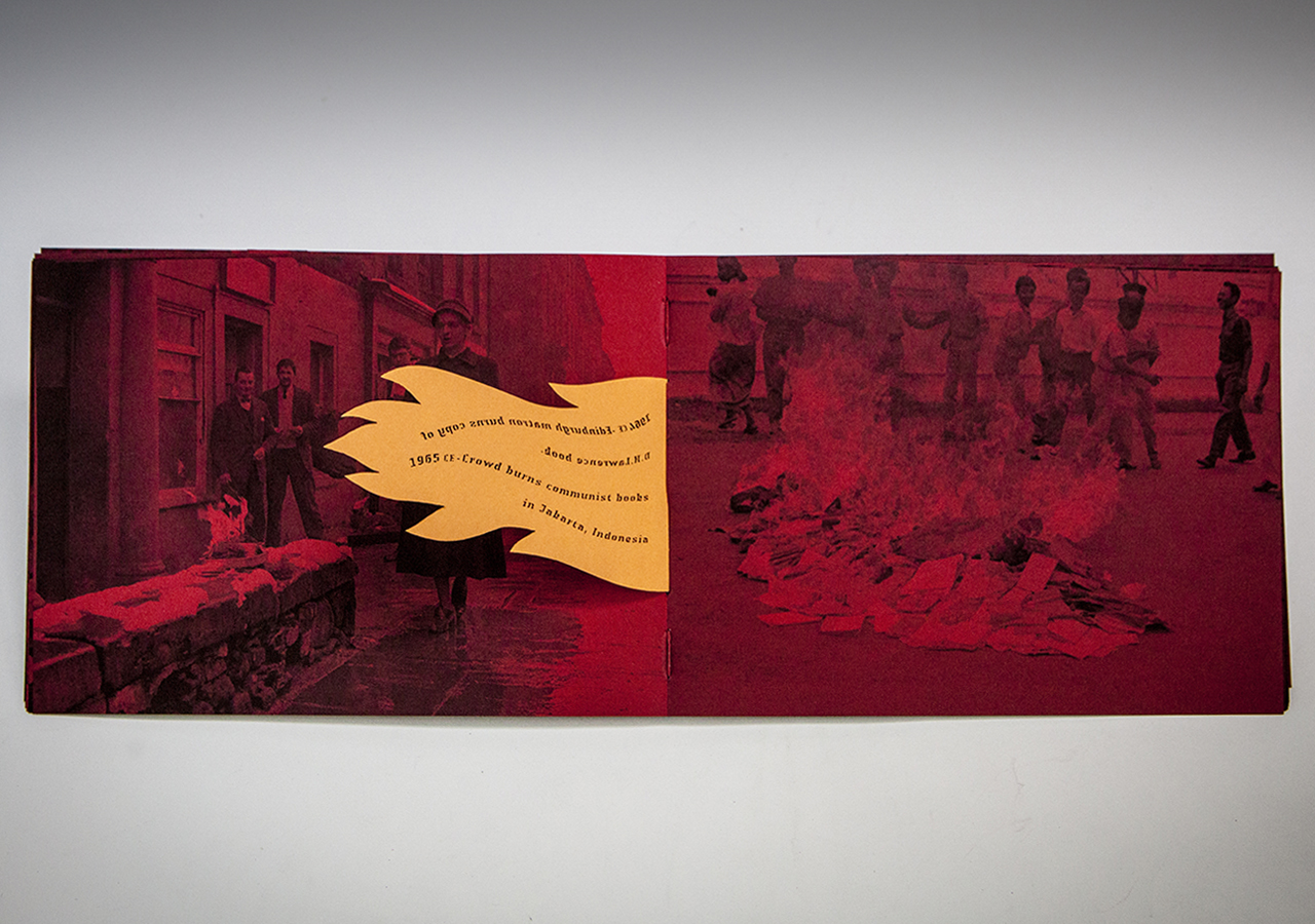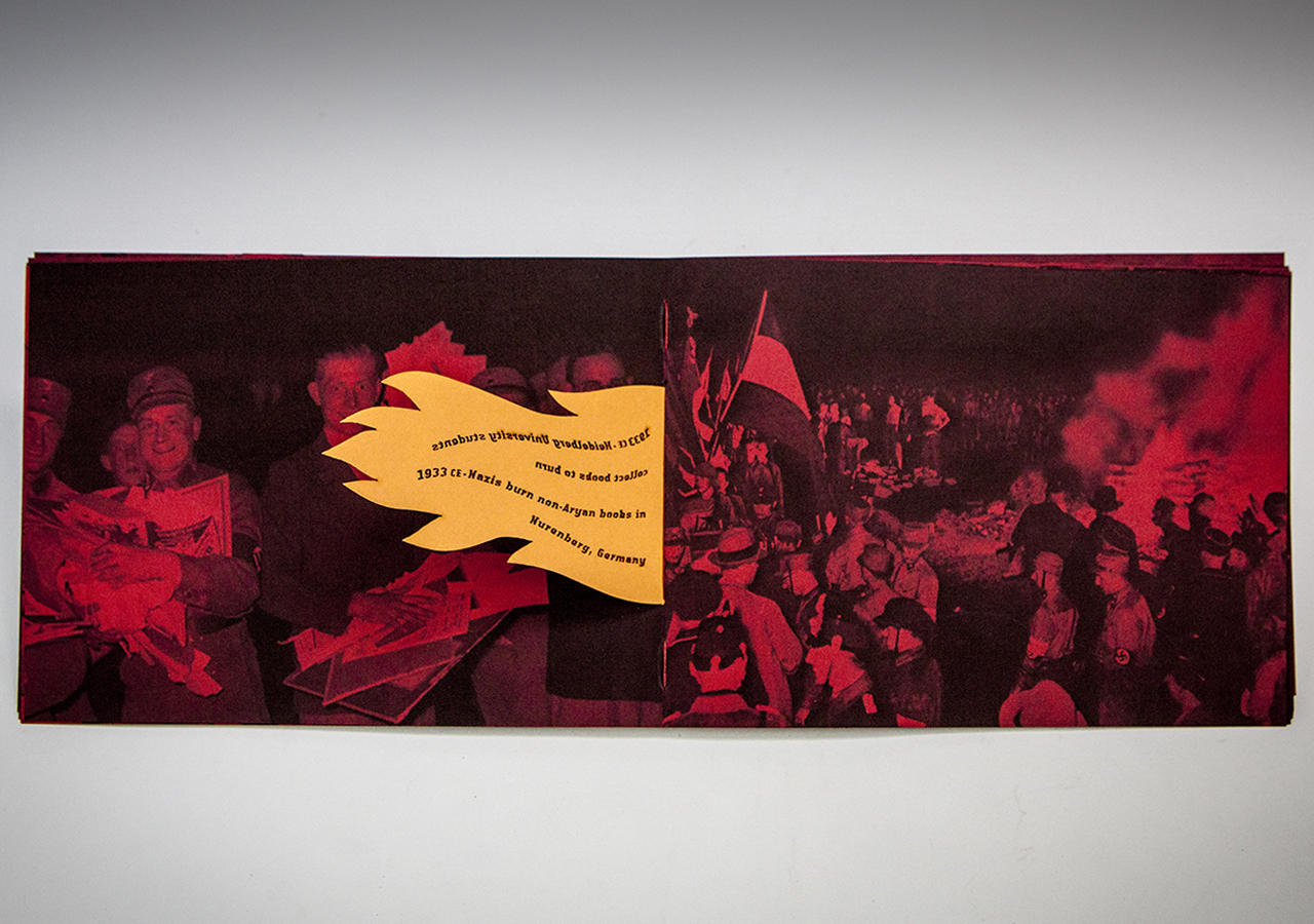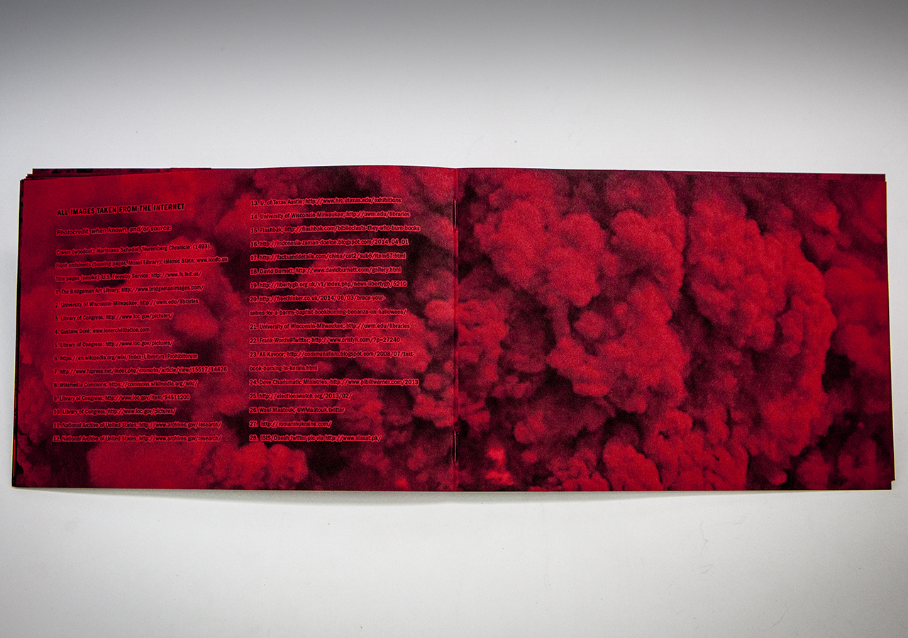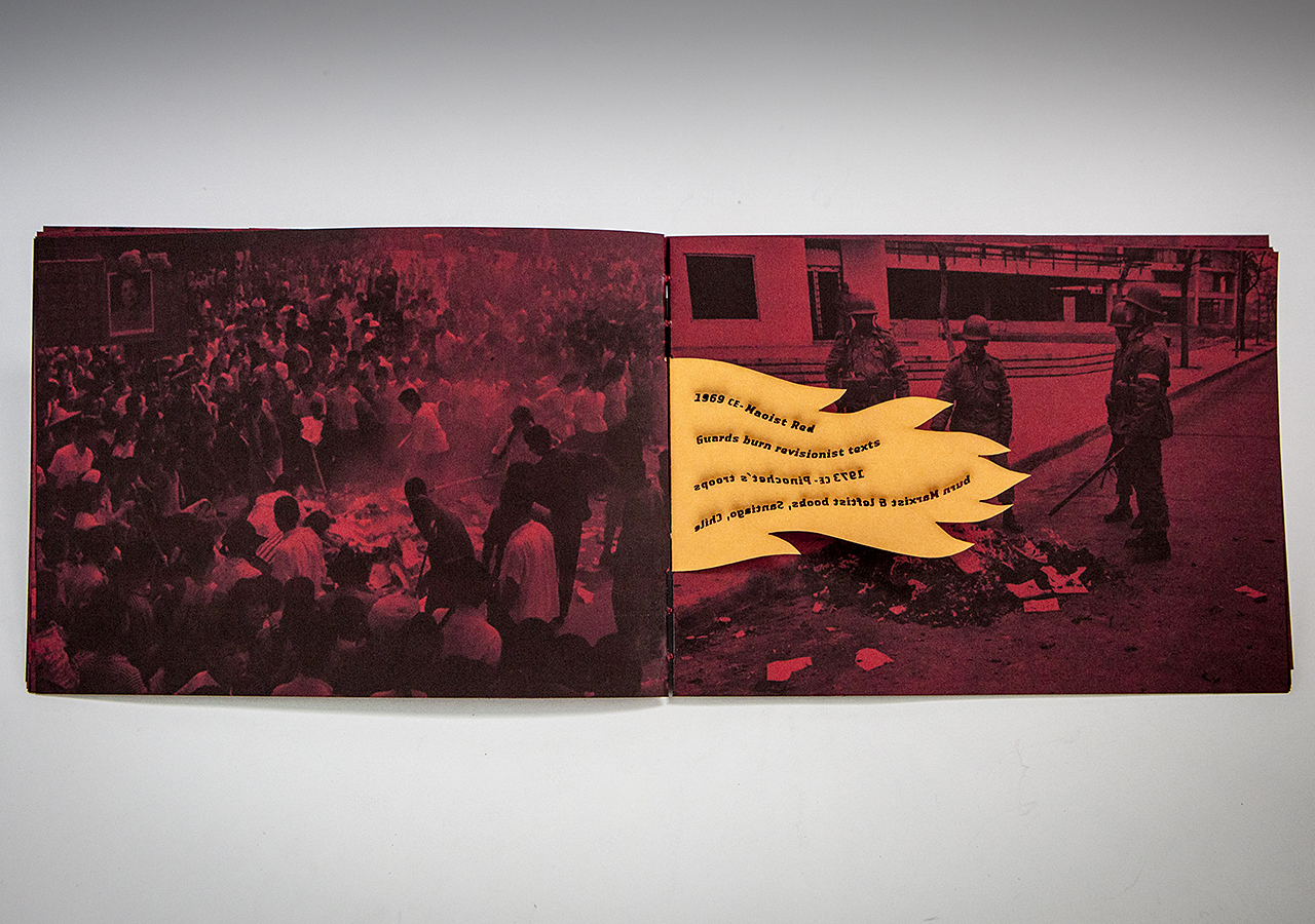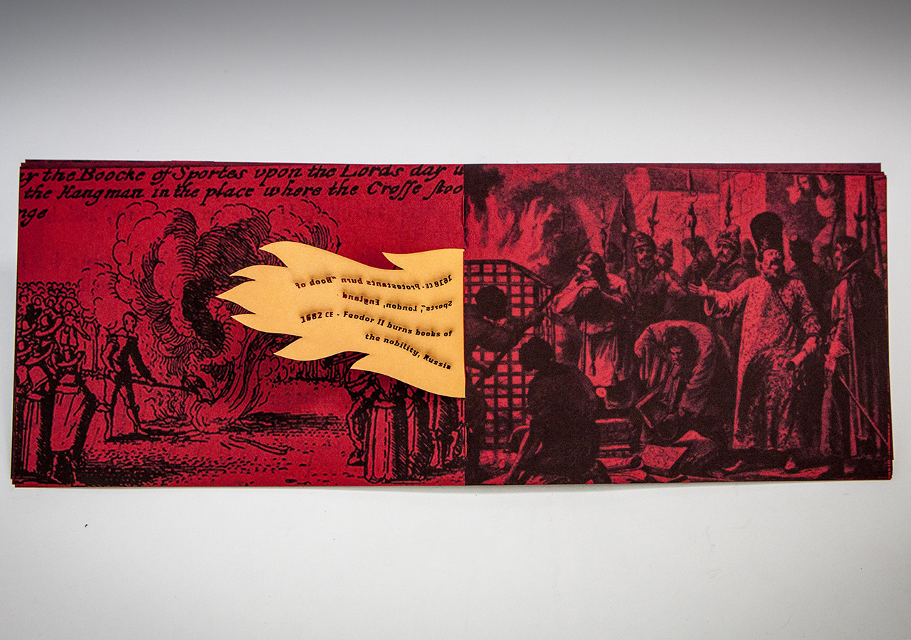 Celsius 233 came out of this research. The book contains 40 pages displaying acts of libricide in chronological order. The title page spread includes a famous quote by Heinrich Heine, whose own literary work was included in some of the book burnings orchestrated by the Nazis. Inserted small orange laser-cut tongues of flame describe the date and action of each image through time. The images were obtained on-line, mostly from the Library of Congress and the National Archive and some educational institution archives. A list of credits appears in a colophon.