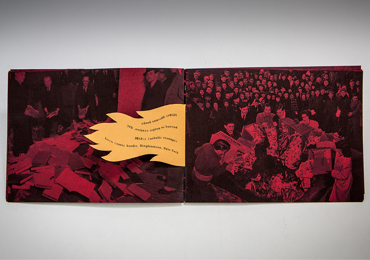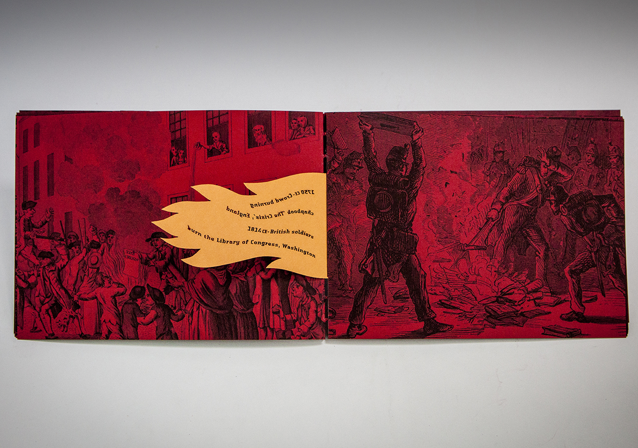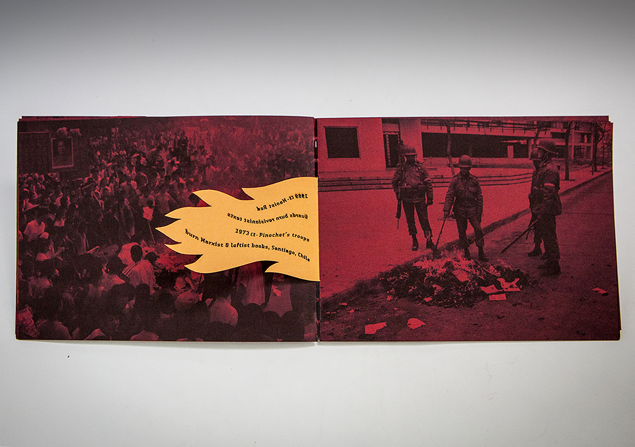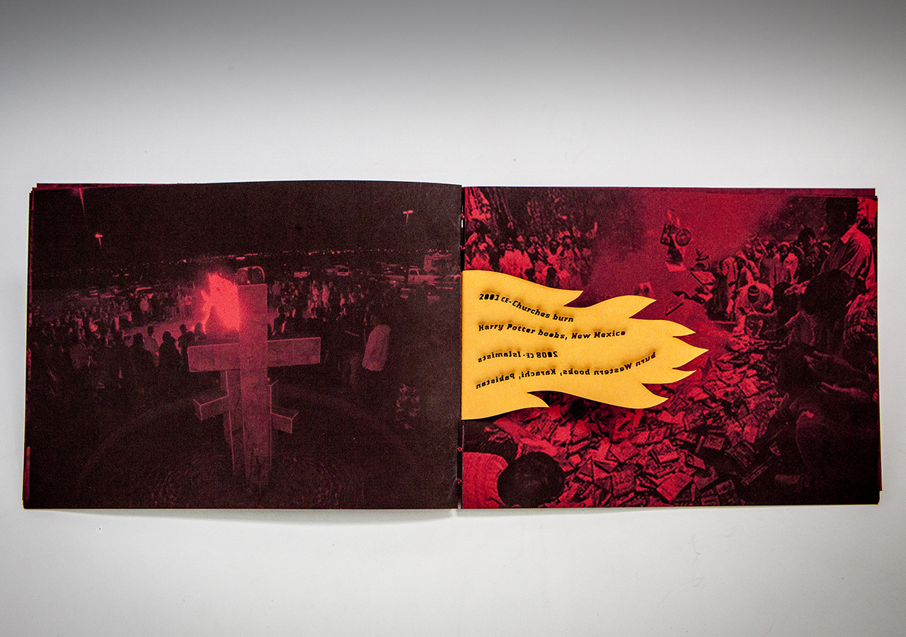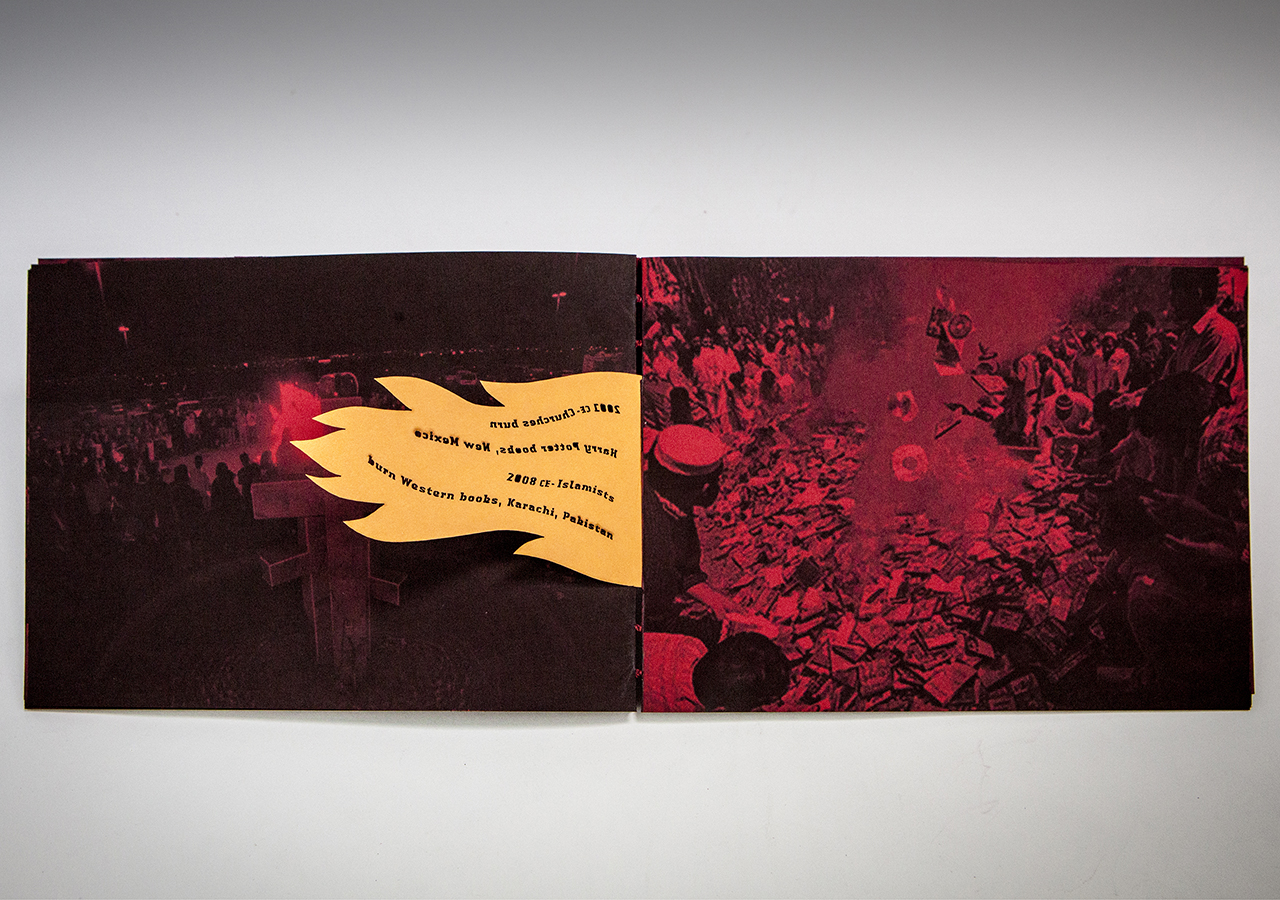 Celsius 233 came out of this research. The book contains 40 pages displaying acts of libricide in chronological order. The title page spread includes a famous quote by Heinrich Heine, whose own literary work was included in some of the book burnings orchestrated by the Nazis. Inserted small orange laser-cut tongues of flame describe the date and action of each image through time. The images were obtained on-line, mostly from the Library of Congress and the National Archive and some educational institution archives. A list of credits appears in a colophon.