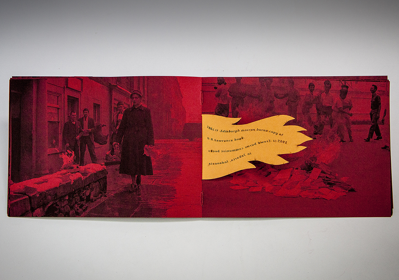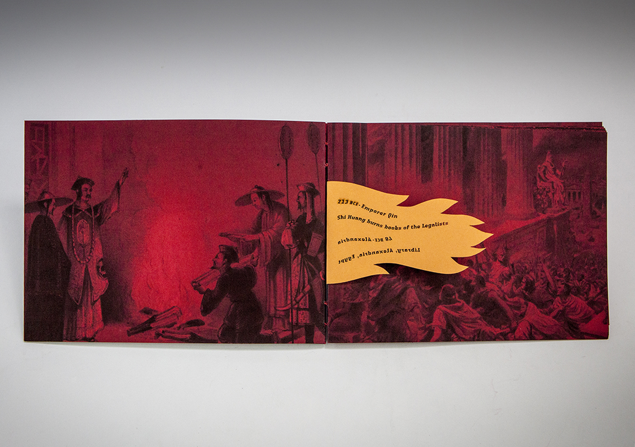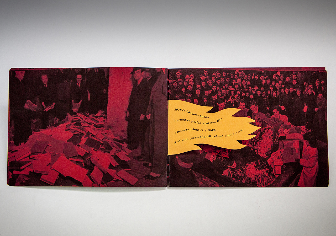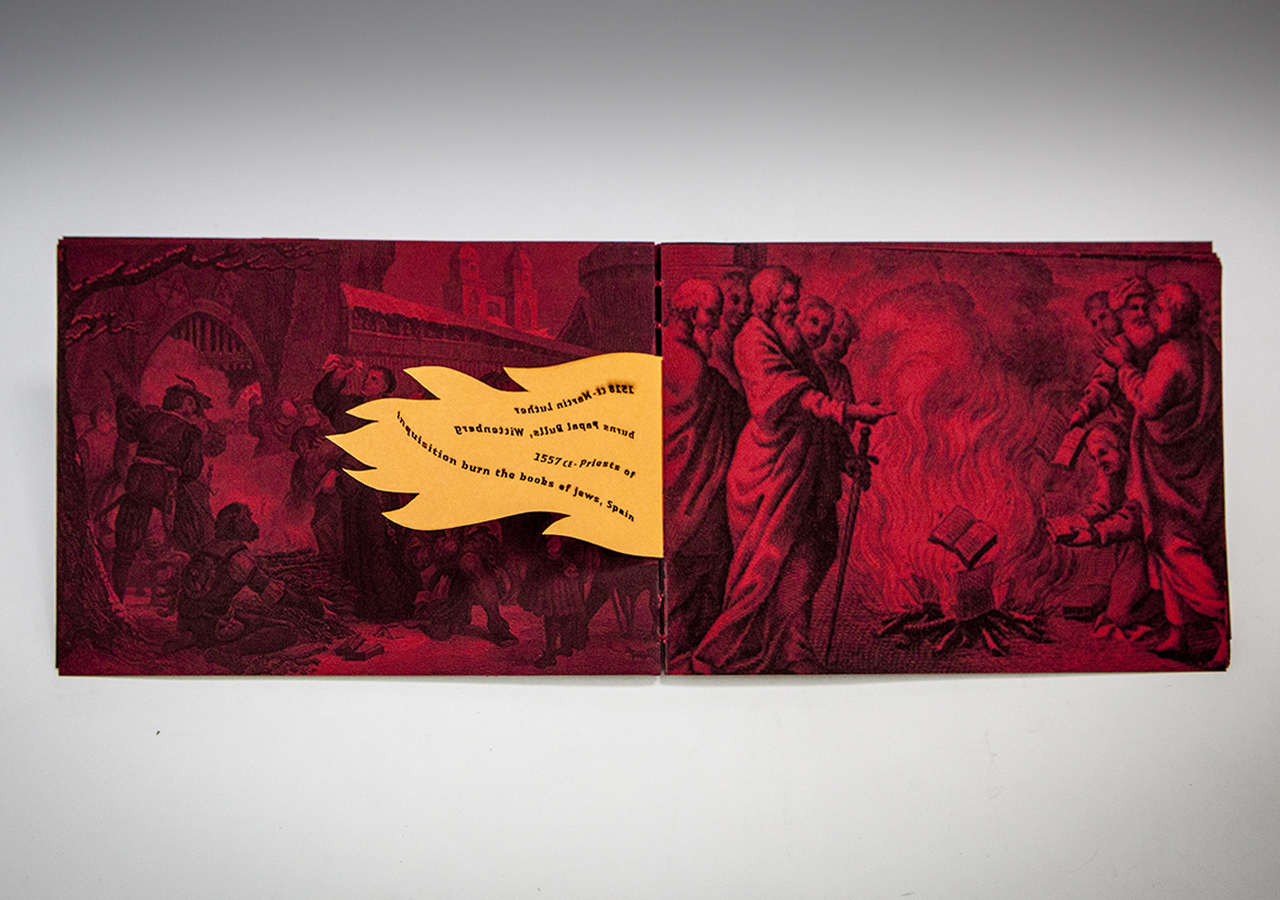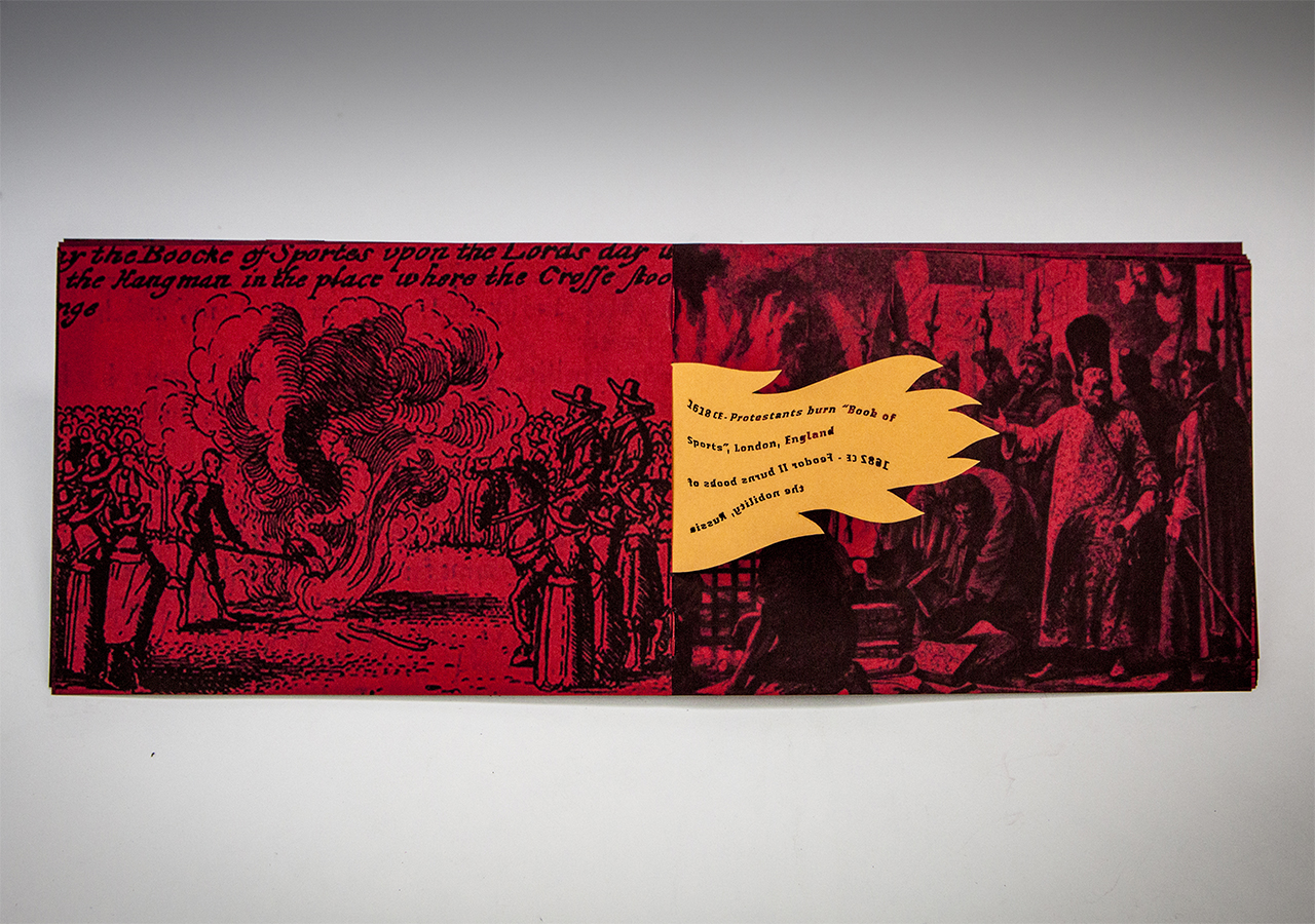 Celsius 233 came out of this research. The book contains 40 pages displaying acts of libricide in chronological order. The title page spread includes a famous quote by Heinrich Heine, whose own literary work was included in some of the book burnings orchestrated by the Nazis. Inserted small orange laser-cut tongues of flame describe the date and action of each image through time. The images were obtained on-line, mostly from the Library of Congress and the National Archive and some educational institution archives. A list of credits appears in a colophon.