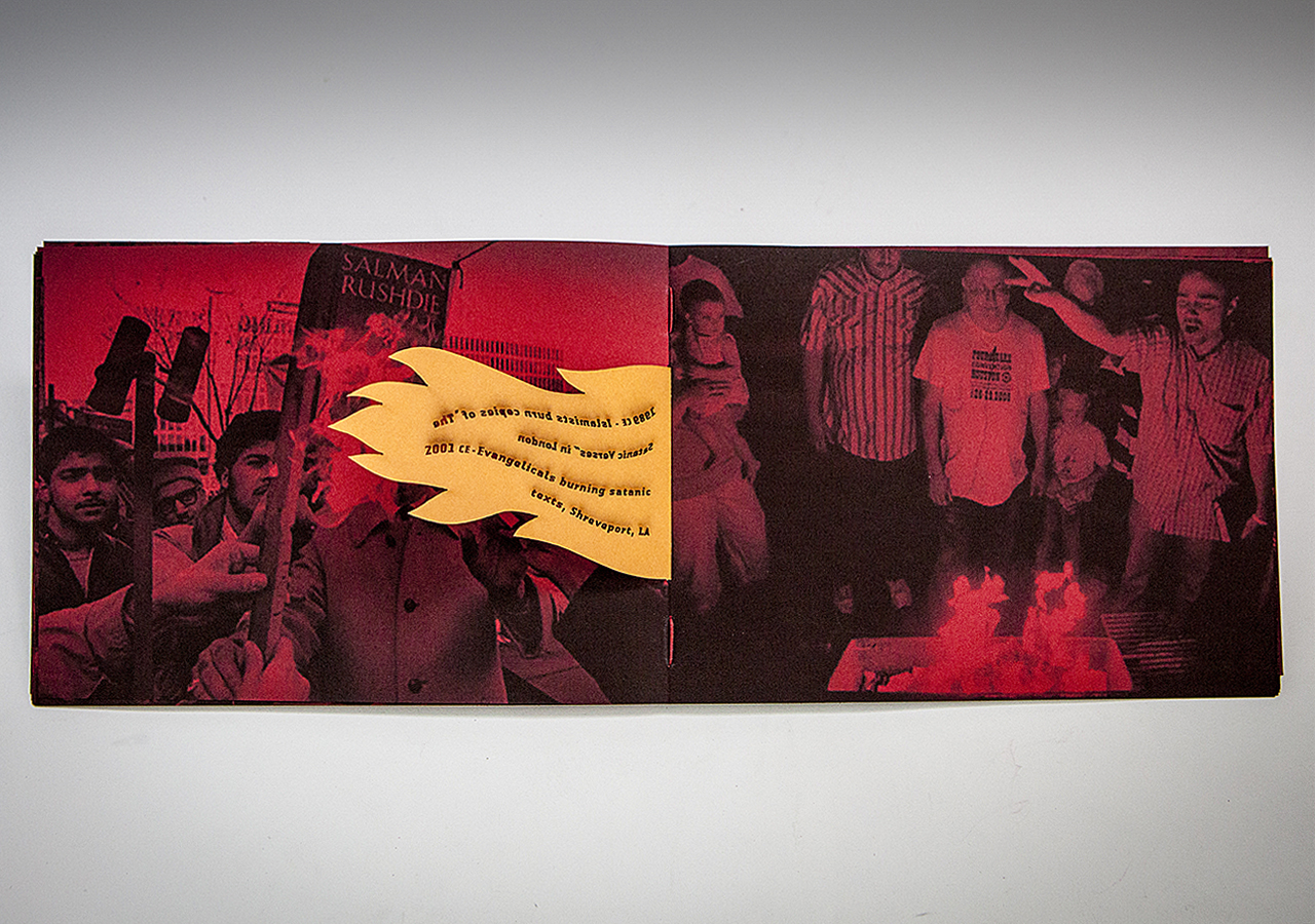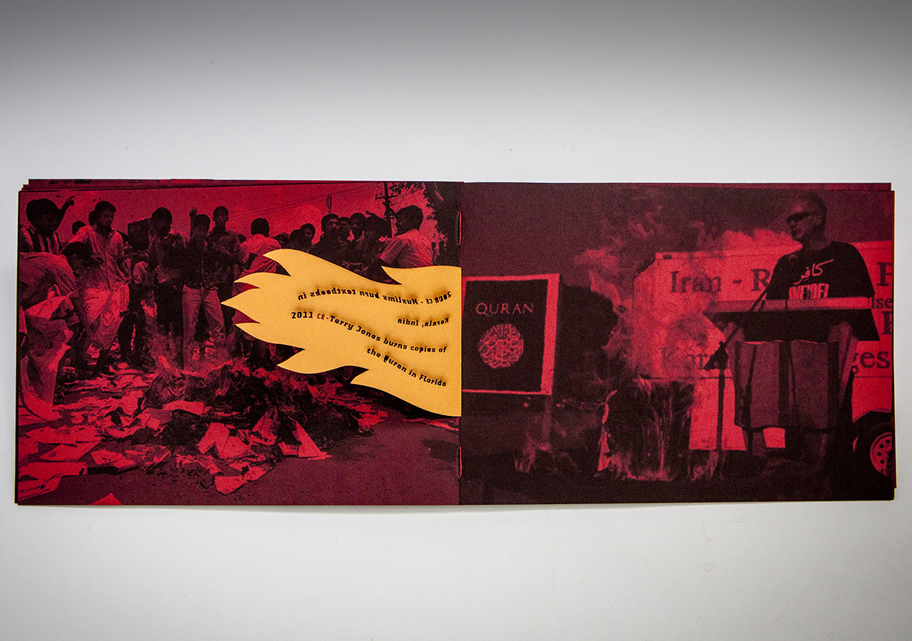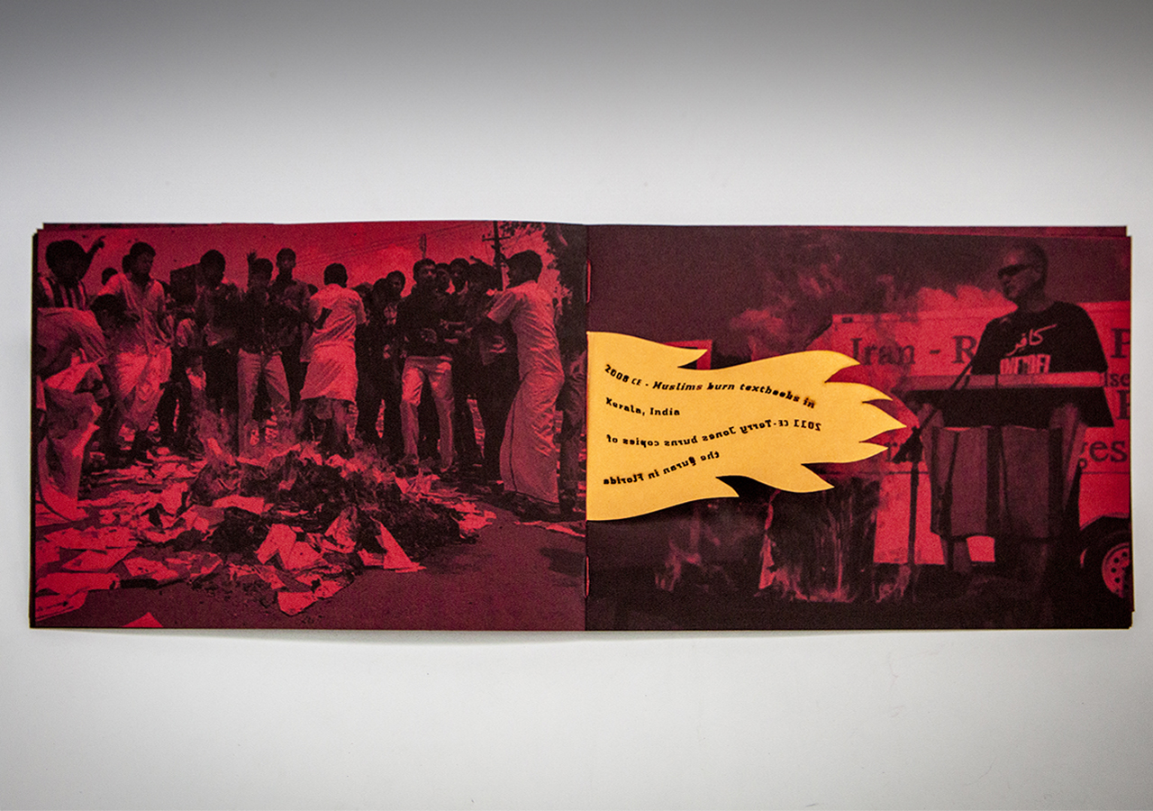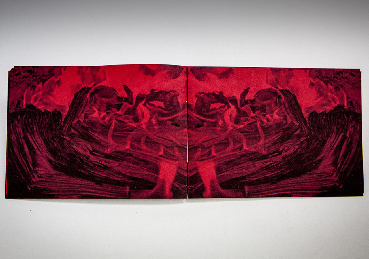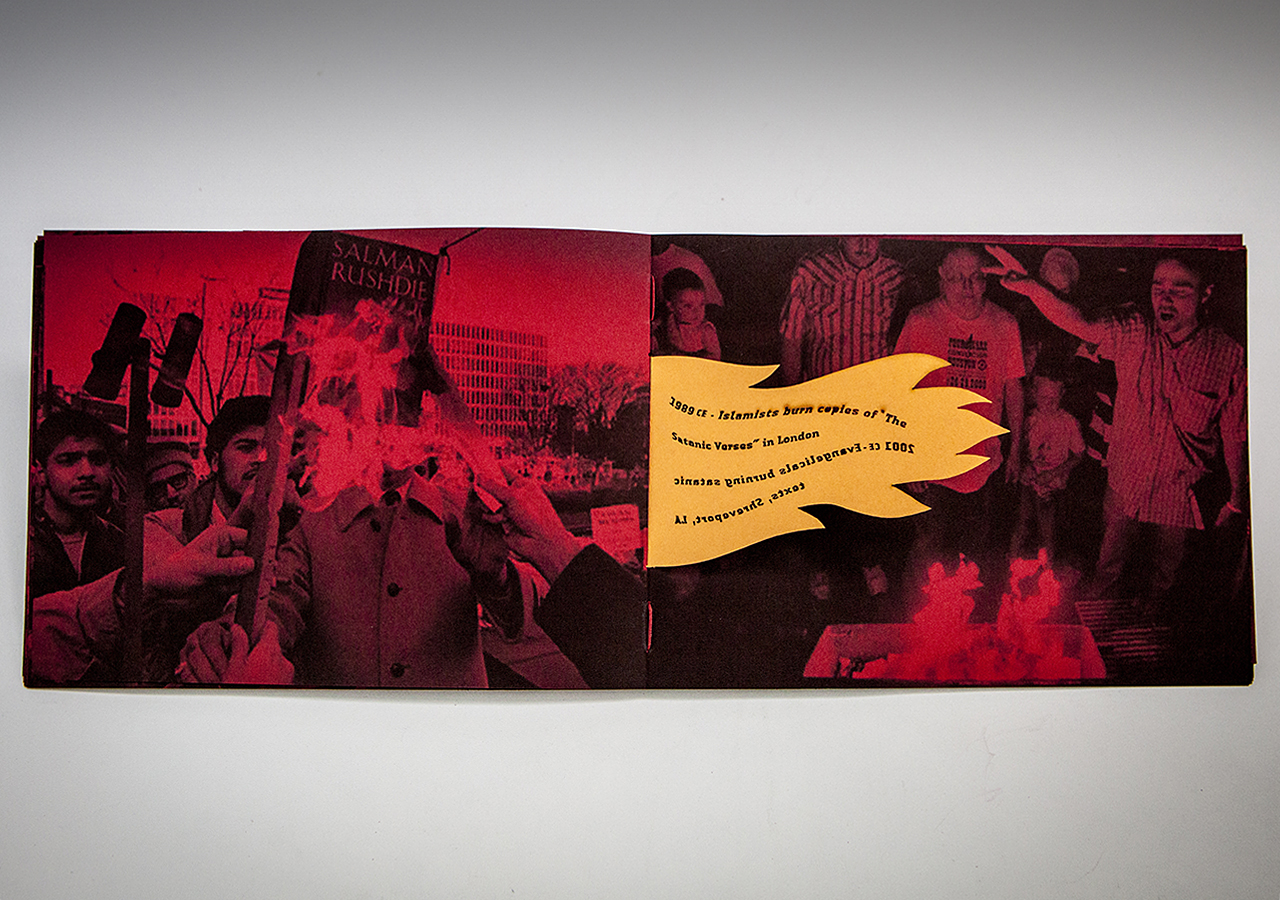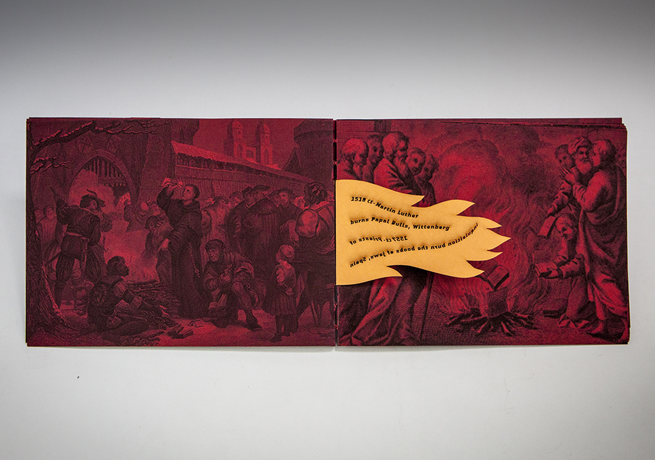 Celsius 233 came out of this research. The book contains 40 pages displaying acts of libricide in chronological order. The title page spread includes a famous quote by Heinrich Heine, whose own literary work was included in some of the book burnings orchestrated by the Nazis. Inserted small orange laser-cut tongues of flame describe the date and action of each image through time. The images were obtained on-line, mostly from the Library of Congress and the National Archive and some educational institution archives. A list of credits appears in a colophon.