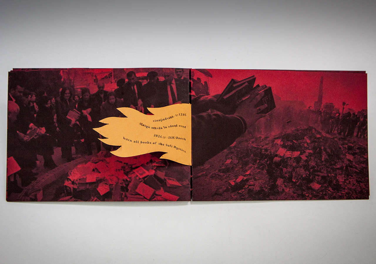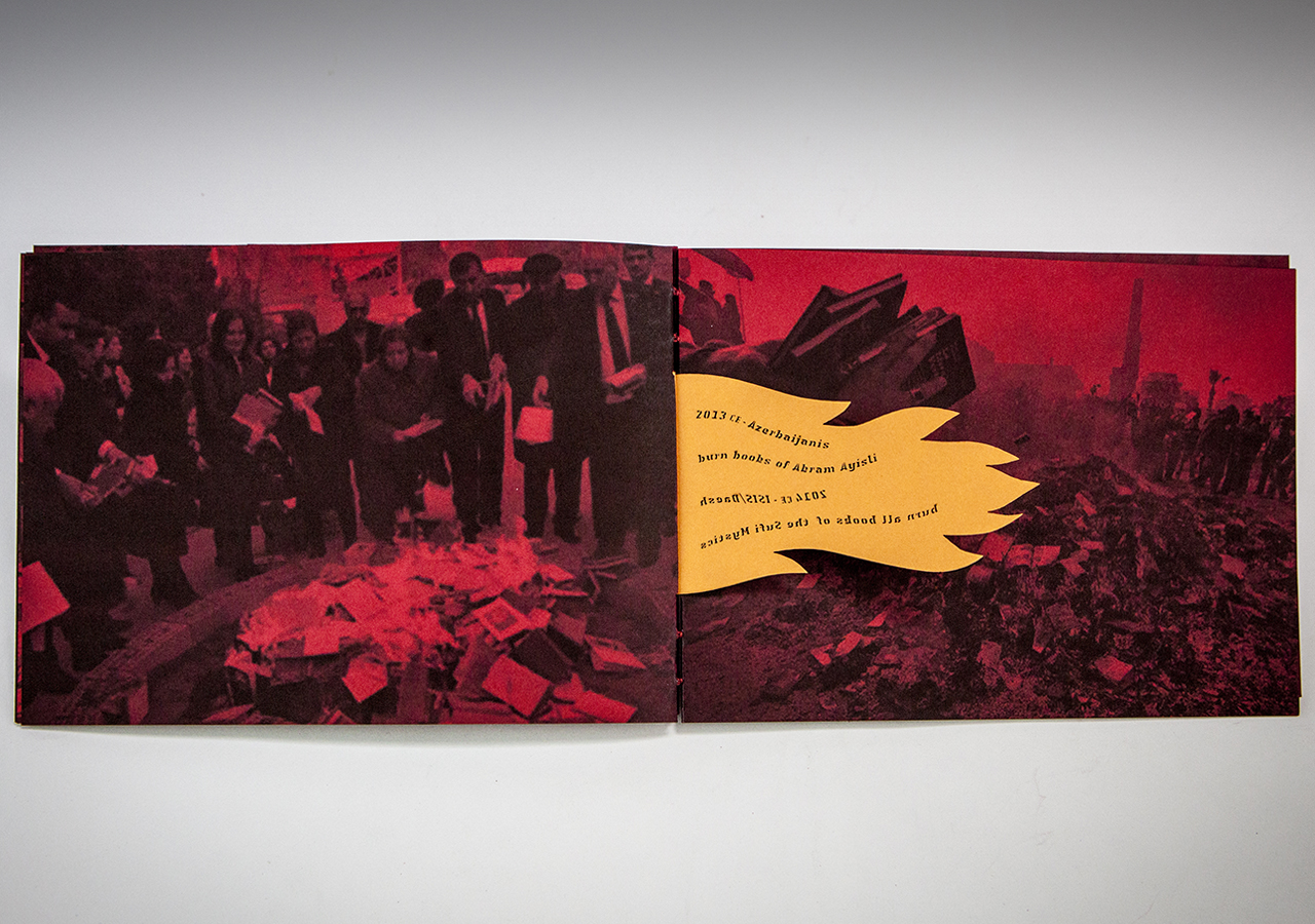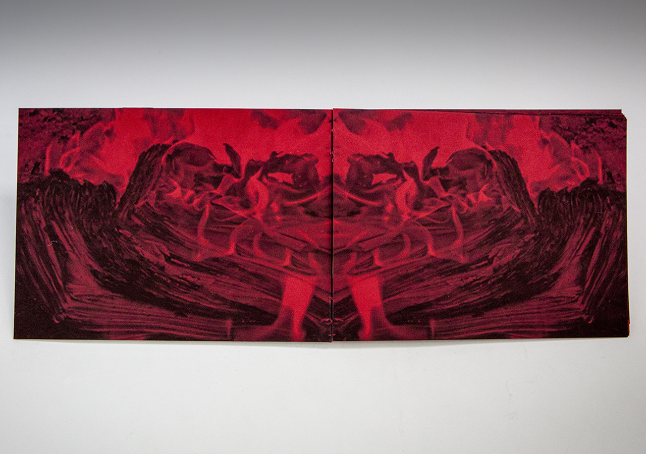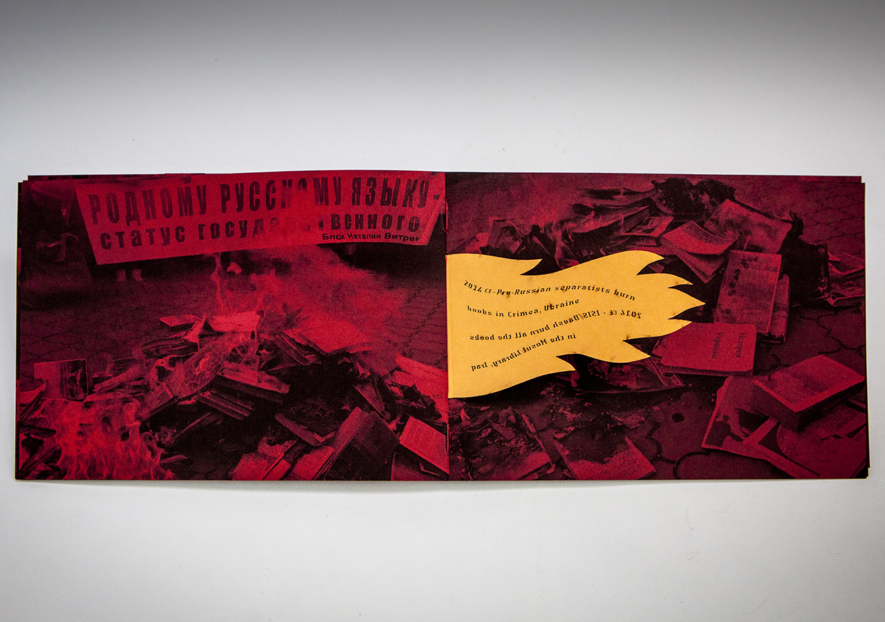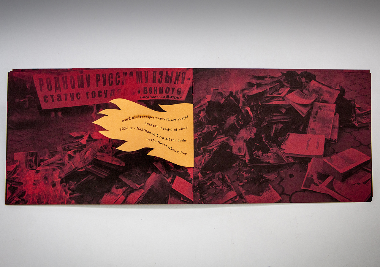 Celsius 233 came out of this research. The book contains 40 pages displaying acts of libricide in chronological order. The title page spread includes a famous quote by Heinrich Heine, whose own literary work was included in some of the book burnings orchestrated by the Nazis. Inserted small orange laser-cut tongues of flame describe the date and action of each image through time. The images were obtained on-line, mostly from the Library of Congress and the National Archive and some educational institution archives. A list of credits appears in a colophon.