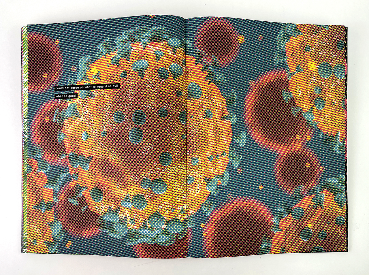 This book is a response to living through the first nine months of the Covid-19 pandemic. The images are enlarged images of the virus, the prophetic text comes from Raskolnikov's fever dream at the end of 'Crime and Punishment', written in 1866 by Fyodor Dostoyevsky. The atomistic halftone treatment of the large viral illustrations attempts to mirror the scientific deconstruction and disassembly of the coronavirus in order to develop a critically important vaccine, our only hope of combatting the virus.