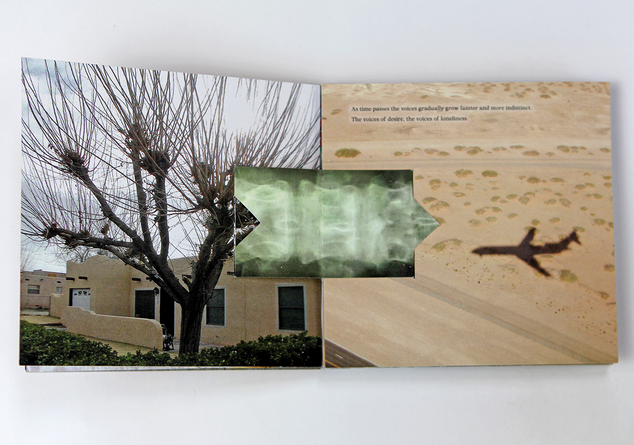 The book is 5.25 x 5.25"; printed by HP Indigo on Mohawk Superfine paper. It is 30 pages long, in a handmade slipcase and comes in a corrugated-paper fold-out archival phase box. The woven spine construction is based on a model developed by Claire van Vliet from a form originally created by Hedi Kyle. The photograph on page six was taken by Elizabeth Alderman, all the others and the text are mine. To be read through on one side, then on the reverse. Accordion-folded, each sheet affixed to the next with paper tabs illustrated with segments of spinal vertebrae. The book takes about half a day to assemble each copy. If you would like to see an animation of the way that the book functions, click here.