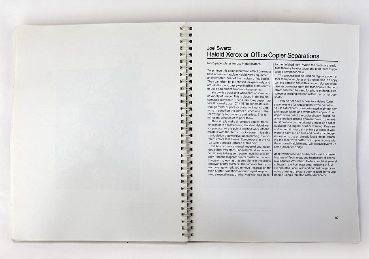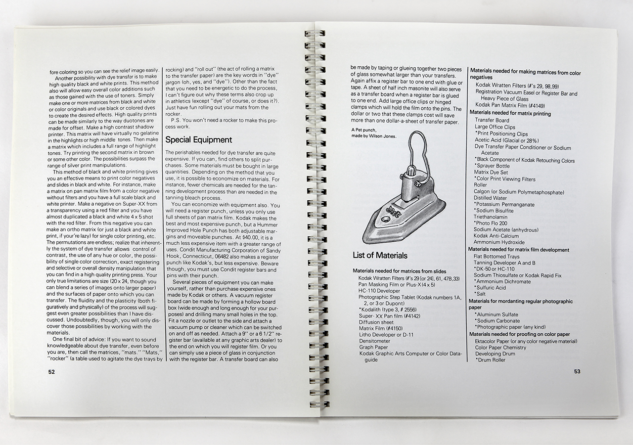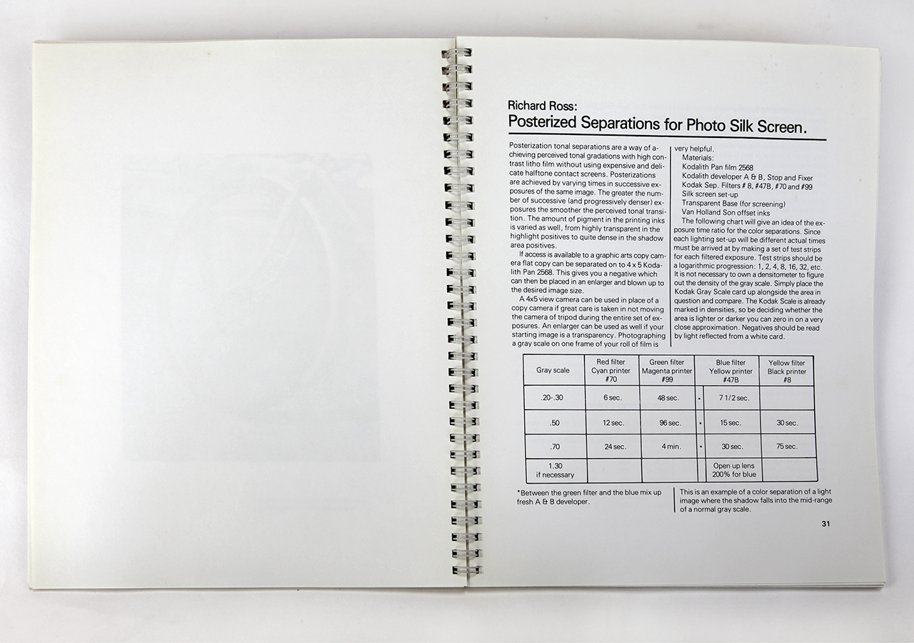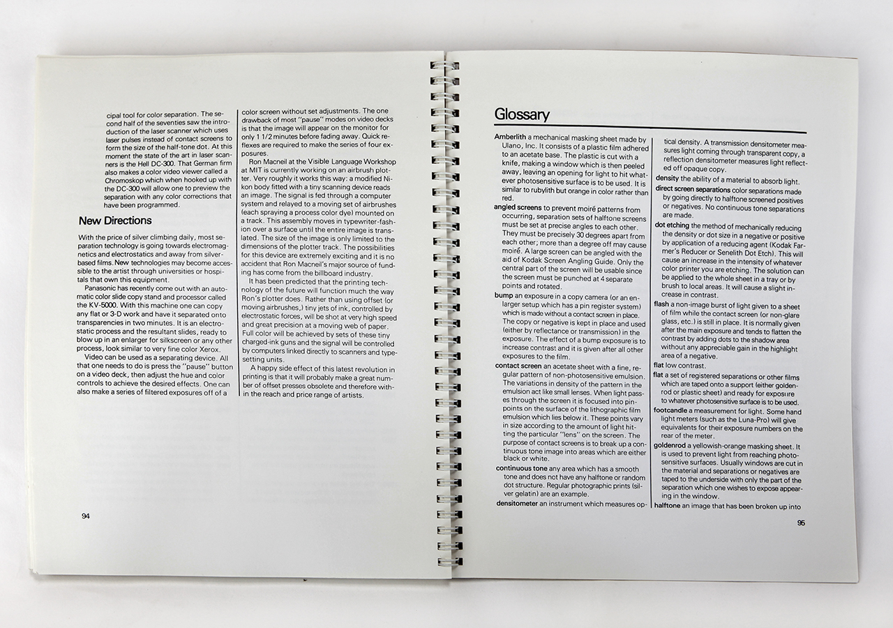 This book is formatted like a cookbook with a lay-flat spiral binding so that it would be easy to use in the darkroom. It was widely used by many around the world to make inexpensive non-traditional color separations and sold out within a couple of years. It should be remembered that this was written before the use of personal computers or Adobe Photoshop. In the Spring of 2009, JAB, The Journal of Artists' Books, issued a special issue, No. 25, on offset printing. Two sections in that issue centered on the historical importance of Options for Color Separation to the artists' book field. The first section was called I (heart) DIY CMYK and was written by Pattie Belle Hastings. The second section was written by Clifton Meador and was called Afterword. For most this book has outlived its usefullness since the advent of Photoshop in the late eighties made making a separation as easy as pressing the command-p key on a keyboard. Things were not always that easy!